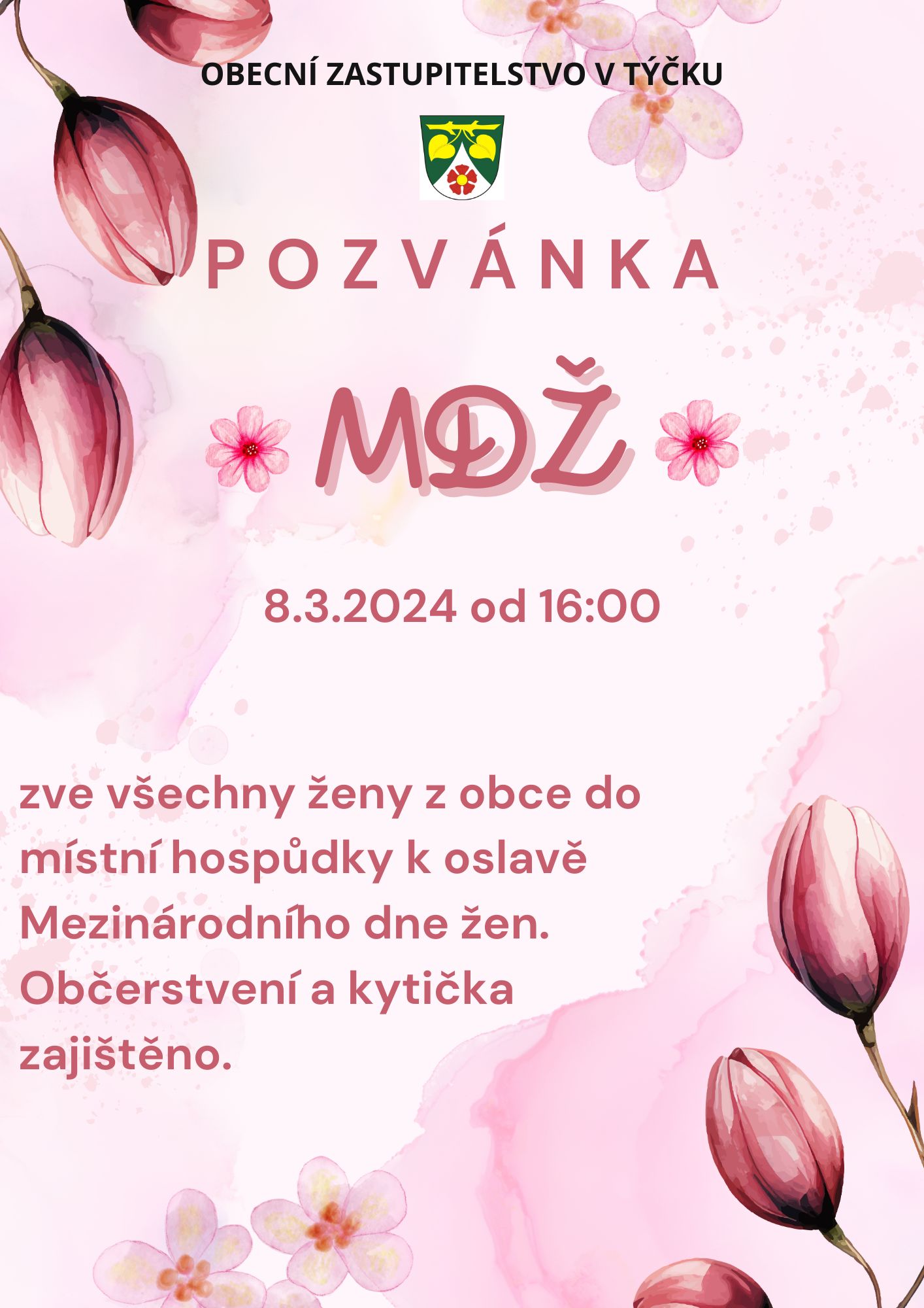 Obecní zastupitelstvo v Týčku zve všechny ženy z obce do místní hospůdky na MDŽ, konané v pátek 8.3.2024 od 16:00hodin