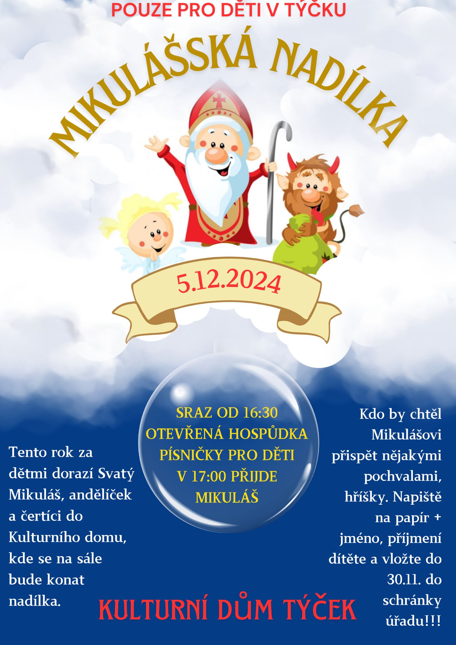 Zveme všechny děti z obce Týček ve čtvrtek 5.12.2024 od 16:30 na sál KD Týček na Mikulášskou nadílku.